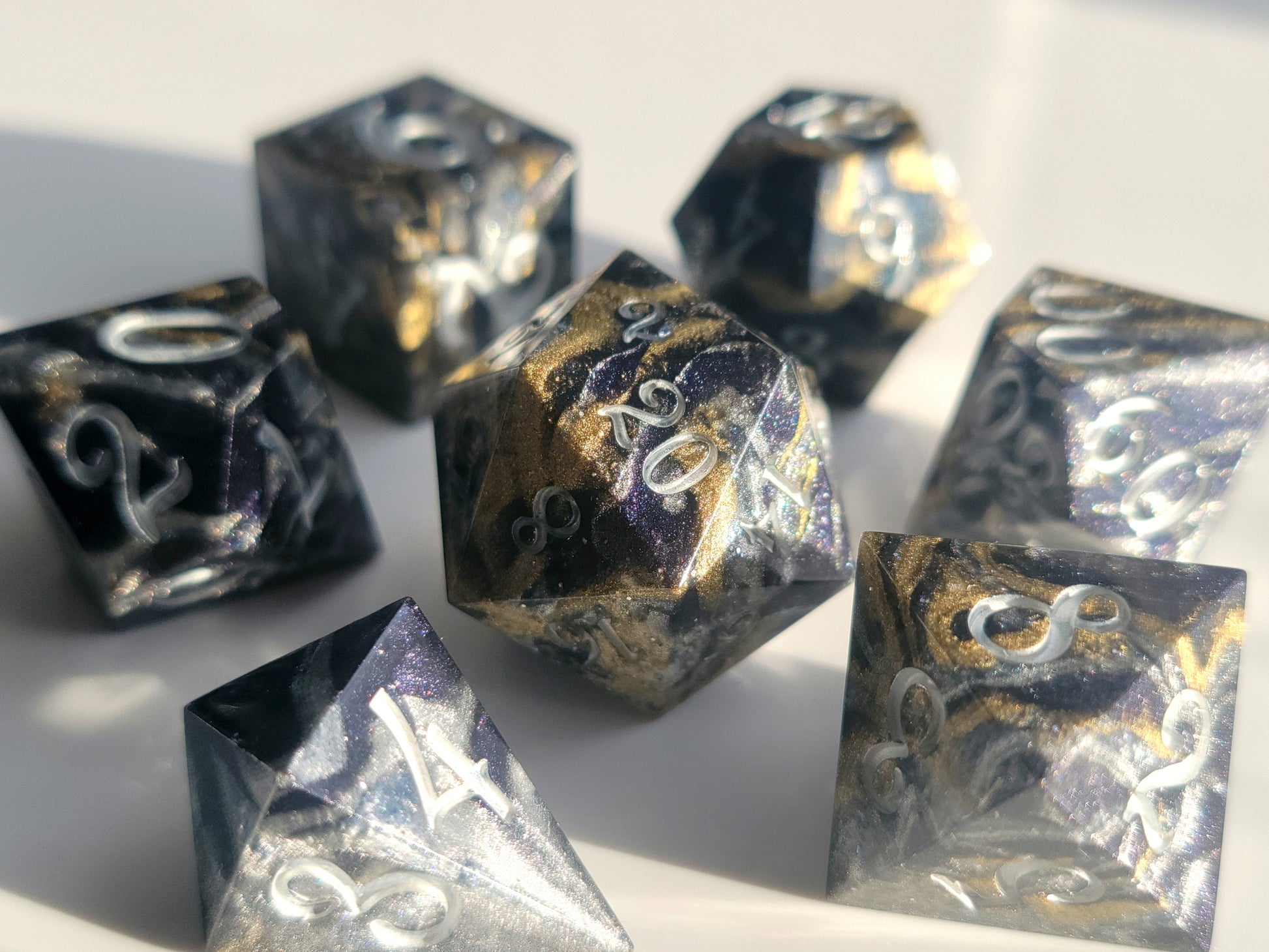 This set includes 7 sharp-edge resin dice (D4, D6, D8, D10, D12, D20, D%) and can be used for TTRPGs like Dungeons and Dragons, Pathfinder, and others!