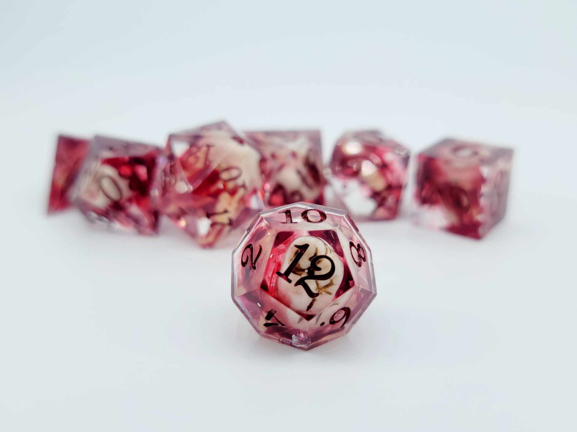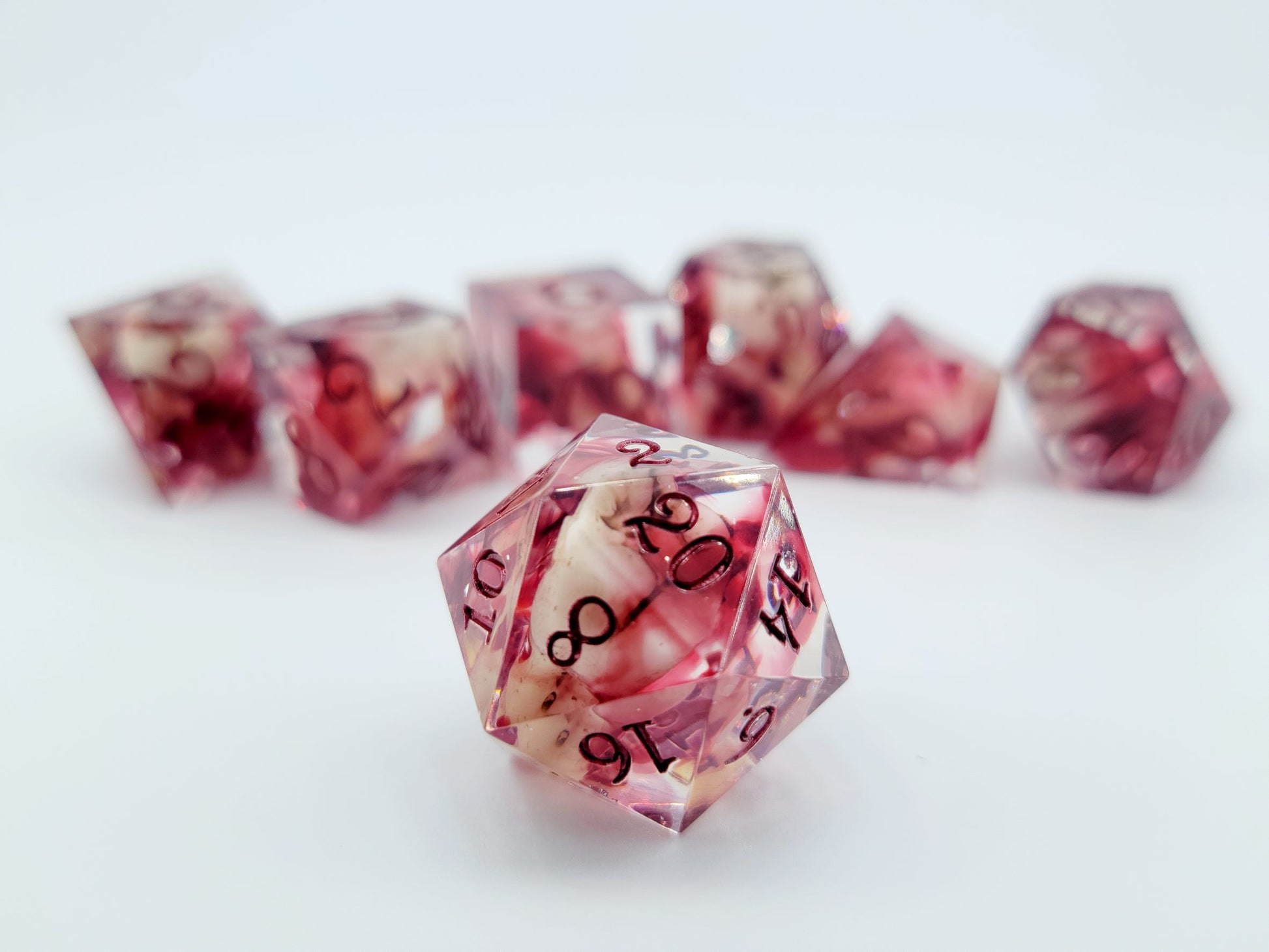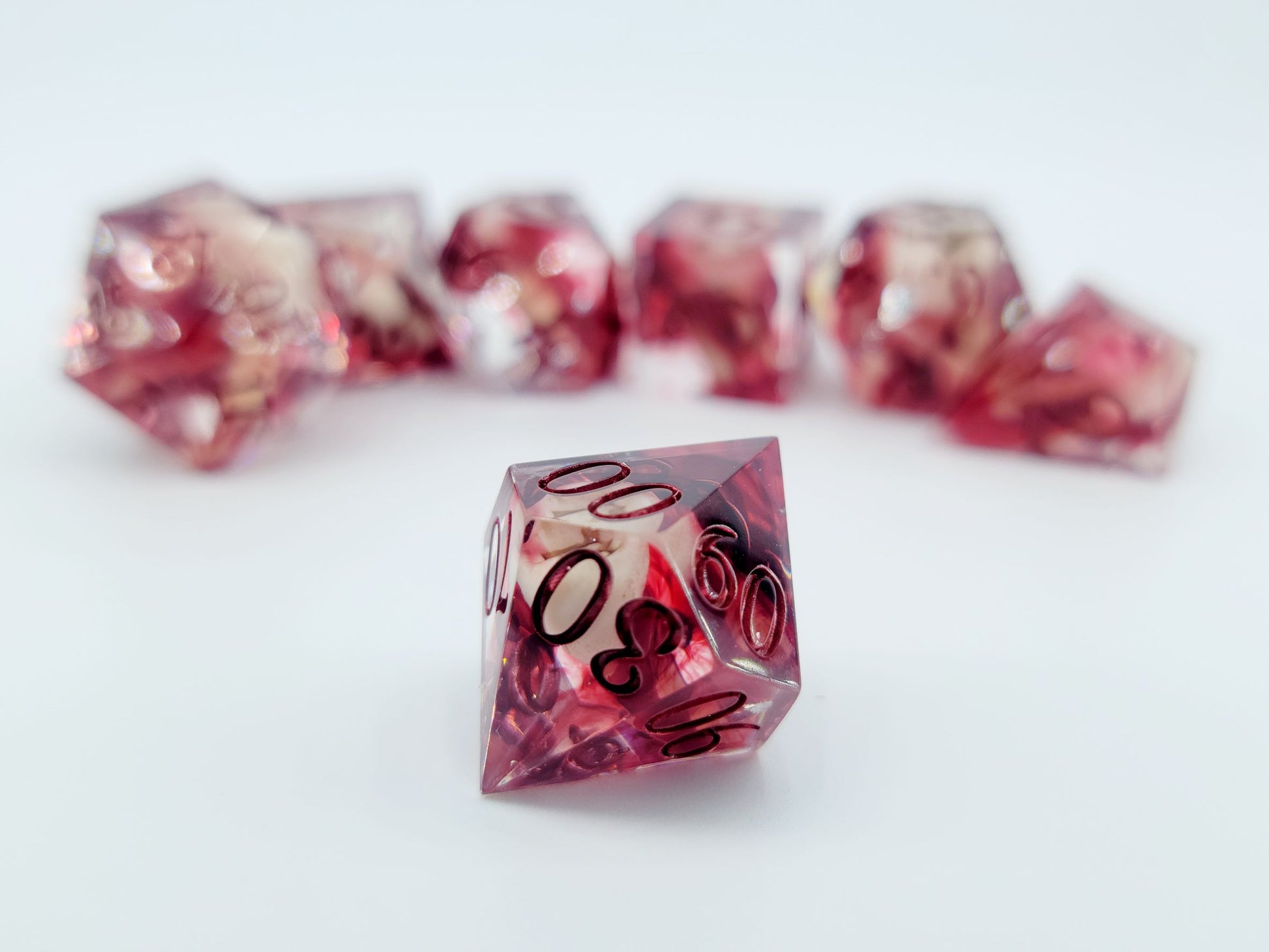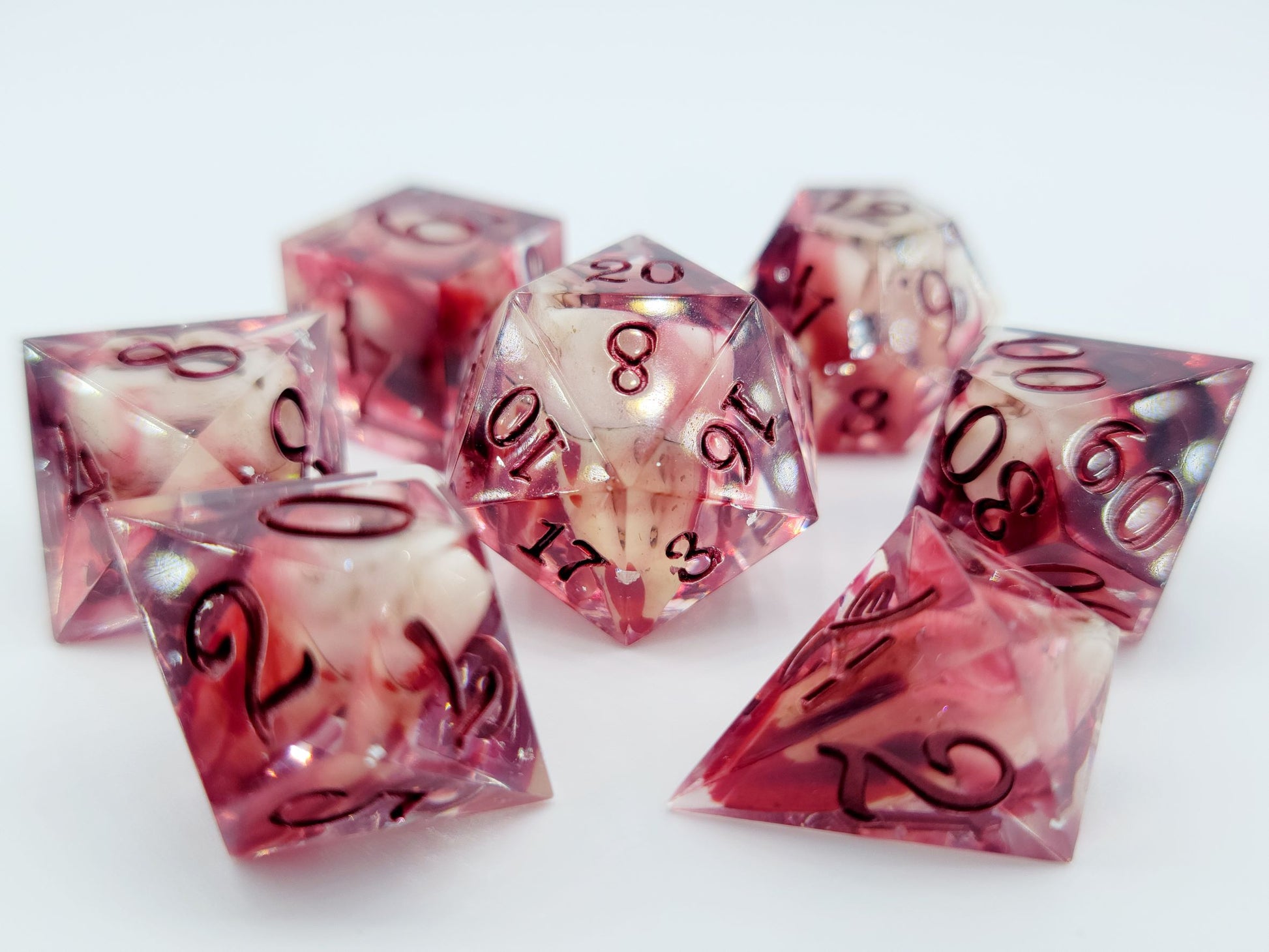 This set includes 7 dice (D4, D6, D8, D10, D12, D20, D%).