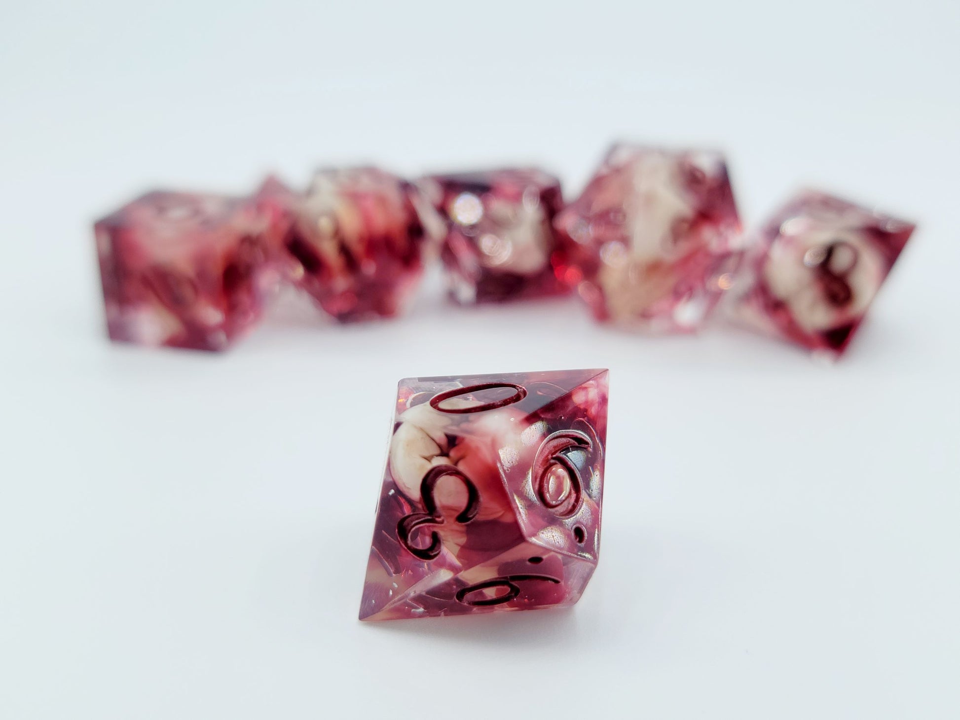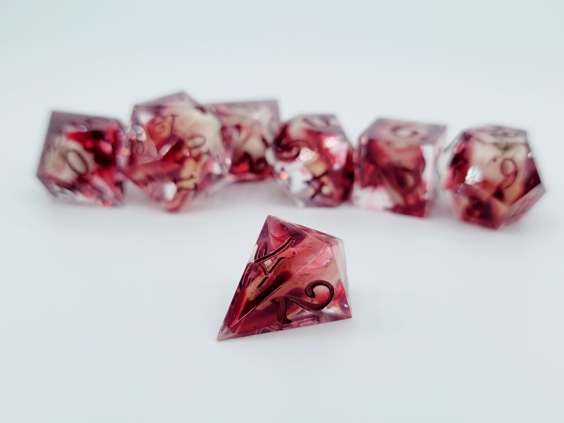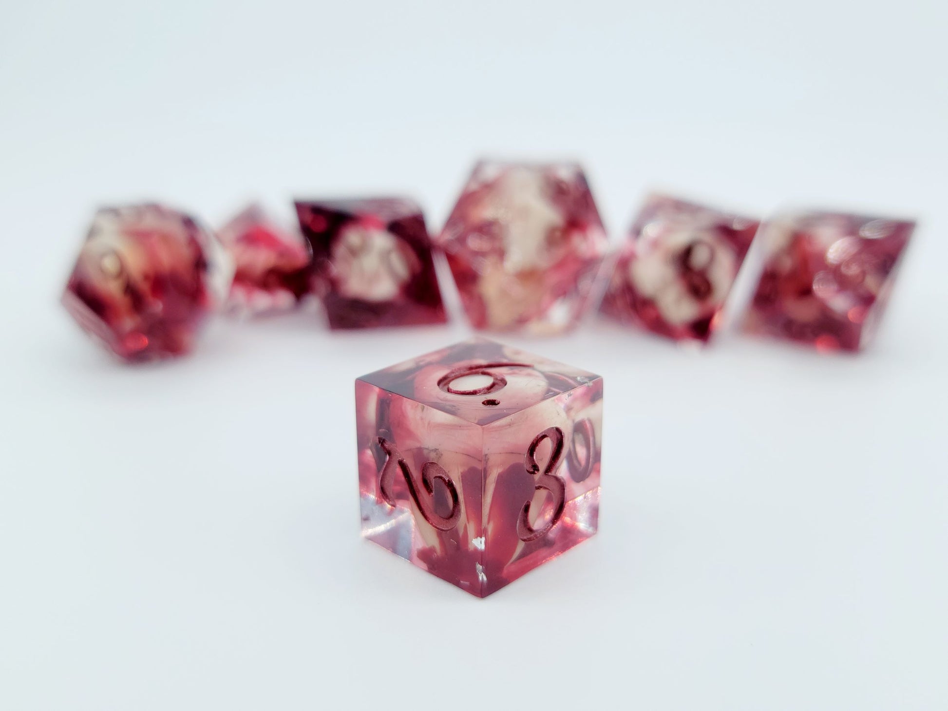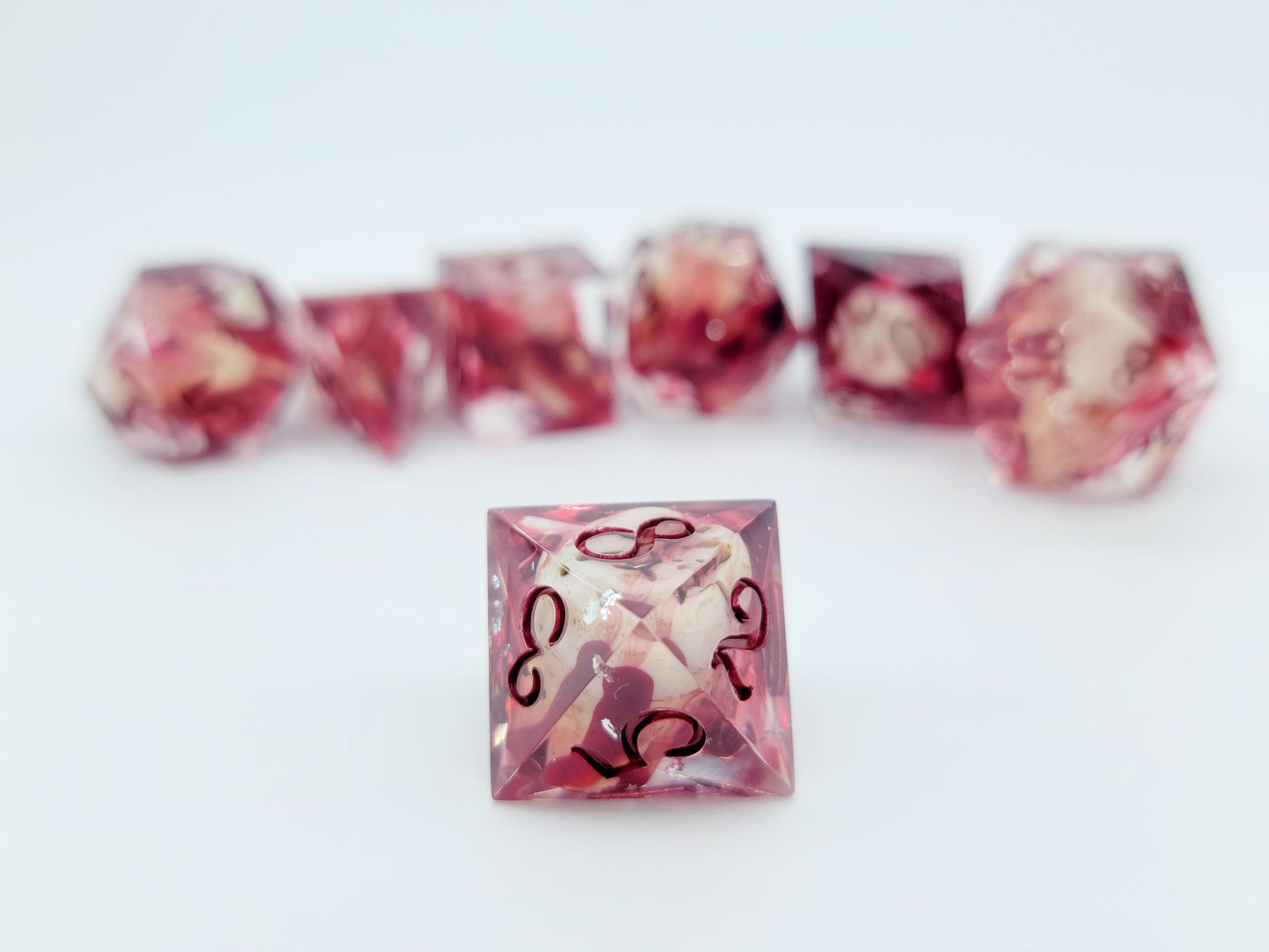 This set includes 7 dice (D4, D6, D8, D10, D12, D20, D%).