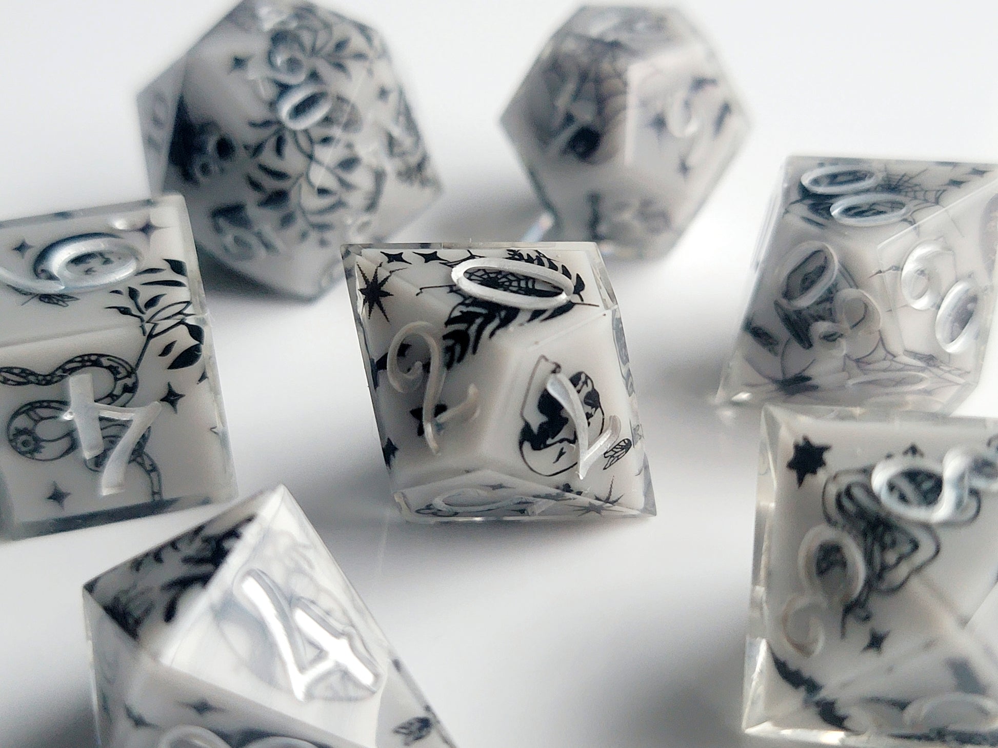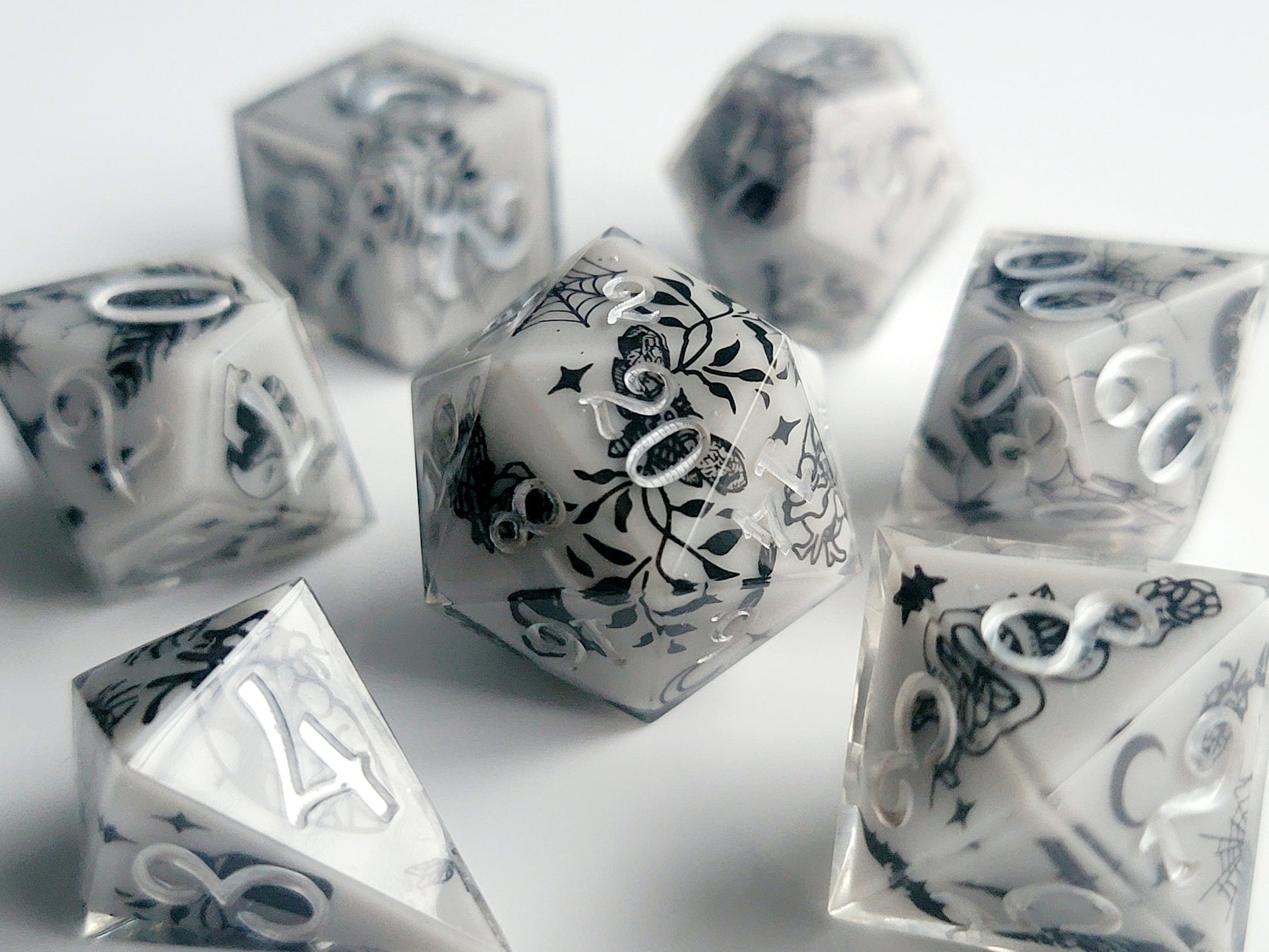 This set includes 7 sharp-edge resin dice (D4, D6, D8, D10, D12, D20, D%) and can be used for TTRPGs like Dungeons and Dragons, Pathfinder, and others!
