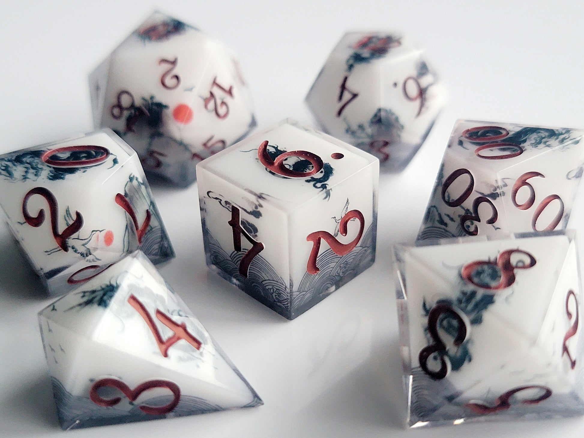 This set includes 7 sharp-edge resin dice (D4, D6, D8, D10, D12, D20, D%) and can be used for TTRPGs like Dungeons and Dragons, Pathfinder, and others!