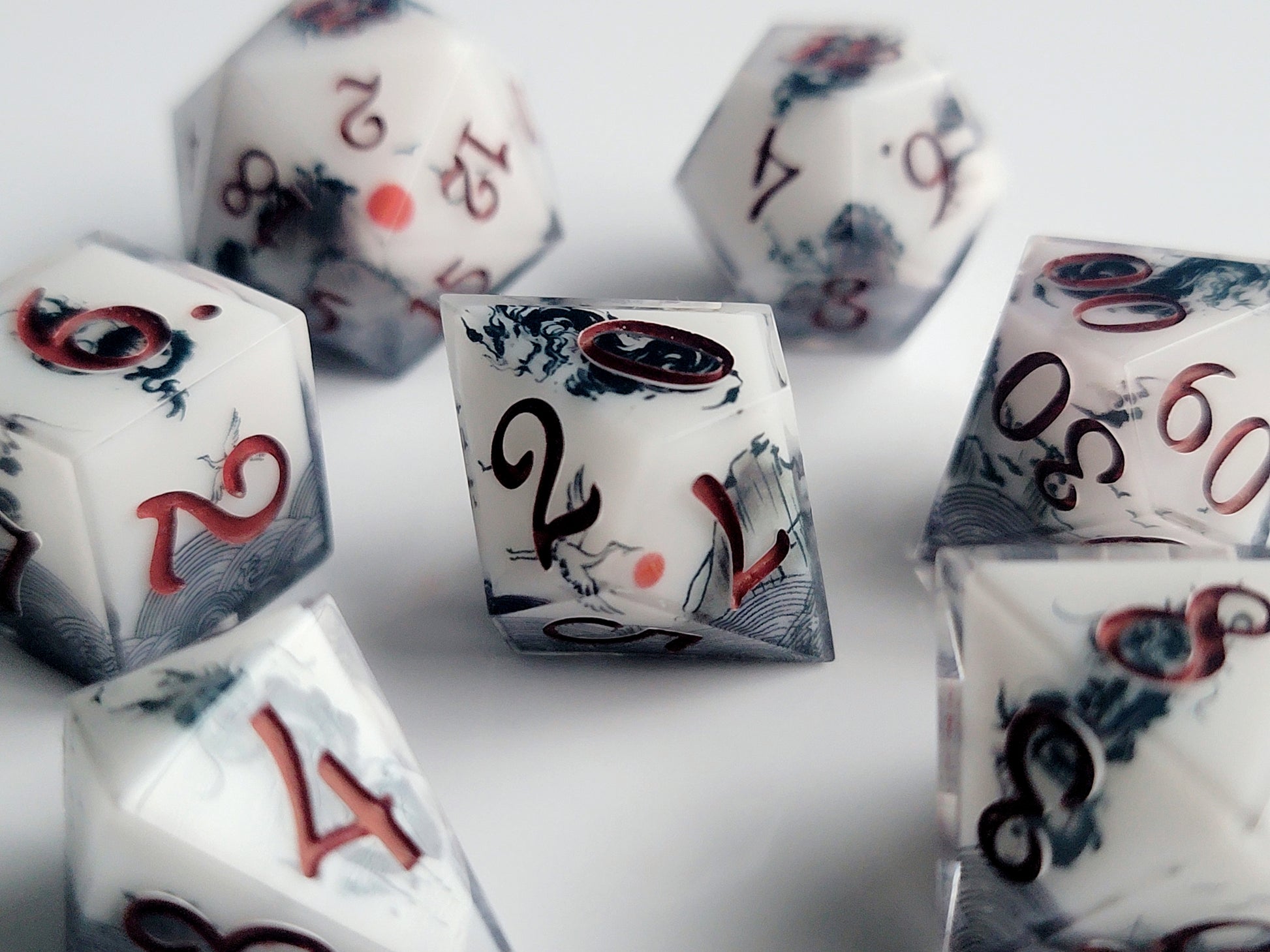 "Sumi Dragon" has an Asian landscape wrapped around it in the style of traditional sumi-e paintings. There is a white core with black and red details and the numbers have been inked in a deep red.